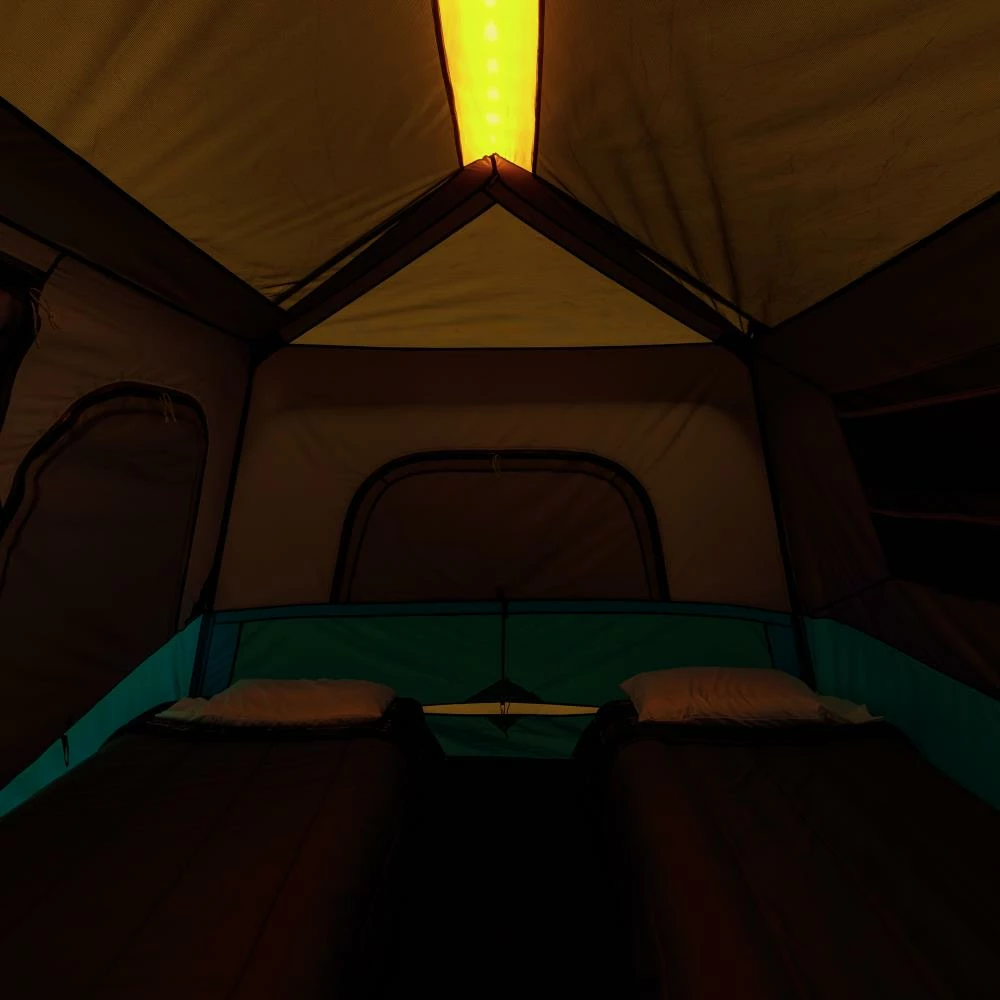 - LED lights are built into the ceiling poles of the tent and Core’s unique diffusing fabric disperses light for a nice even glow