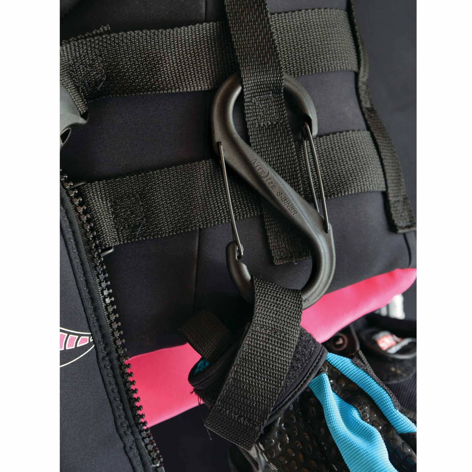 Made of lightweight plastic and available in bright colors, this double-gated gated carabiner has ultra-handy dual spring gates that will hold, secure, and connect everything from house keys and cell phone holsters to technical camping gear. Attach valuables to the center bar for ultimate security, link gate ends to a second set of items and anchor, or connect many items together. This medium size #6 connects everything from water bottles (to belt loops or backpacks), boots, skates, waders, sports gear, and garden gloves (to garage hooks and hanging straps), reusable grocery bags (to closet pegs and grab handles in your car). Identify at a glance while you organize – choose different colors to differentiate sets of keys, luggage, car fobs, ski passes, and all your other organized personal items.