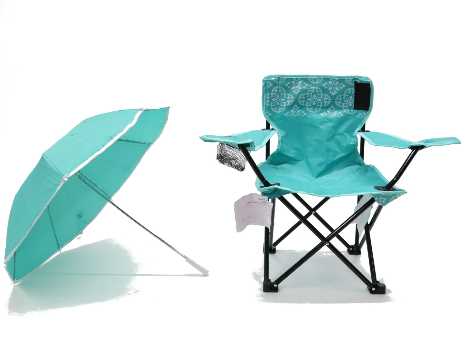 - Complete folding camp chair with removable shade umbrella and matching tote bag